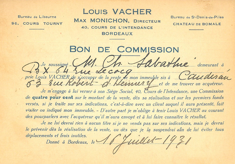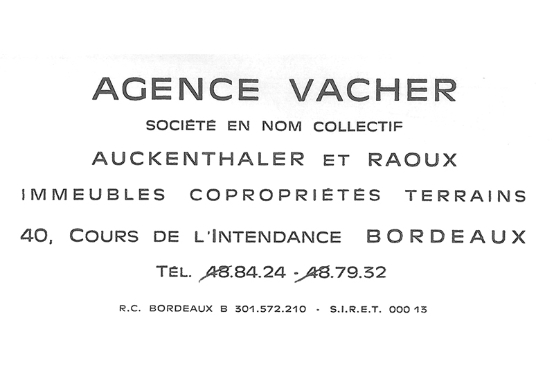 La France connaît de grandes transformations. La société, jusqu’alors rurale, devient urbaine. Les villes se transforment et de nouveaux besoins se dessinent. C’est dans ce contexte que Louis Vacher crée la SARL « Louis Vacher & cie », spécialisée en transactions commerciales dans le centre-ville de Bordeaux